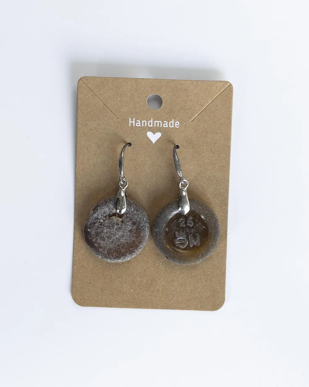 Ein ganz besonderes Paar Ohrringe aus matt-braunem Seeglas könnt ihr hier erwerben. Die Glasstücke waren einmal Flaschenböden von kleinen Kräuterschnapsfläschchen. Das wir zwei sehr ähnliche Exemplare gefunden haben, machen dieses Paar Ohrringe zu einem Highlight in unserem Webshop. Das sich hierbei um Unikate handelt ist selbstverständlich. Auf dem einen Glasstück ist die Zahl 26, der BUchstabe S mit einer Krone und der Buchstabe M zu erkennen. Freut euch auf dieses tolle Paar Ohrringe. Die Aufmerksamkeit eurer Freunde und Familie ist euch sicher. Die Hänger sind aus Silber.